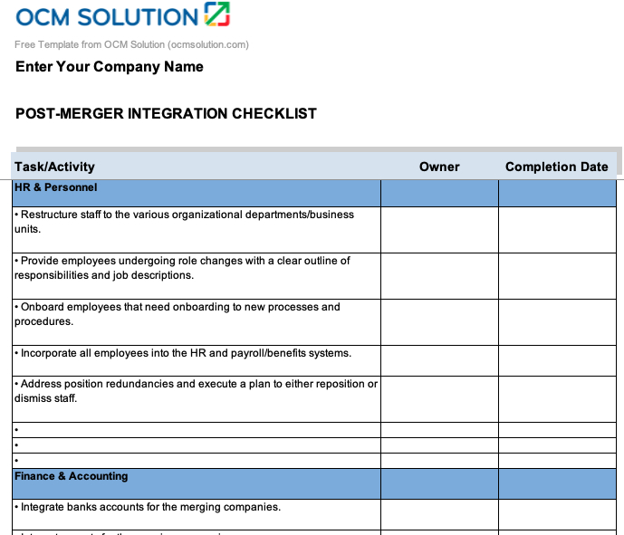 There will be a number of finance and accounting tasks that need to be completed as part of your integration plan template. The OCM Solution template is designed to be used as your post merger integration finance checklist.