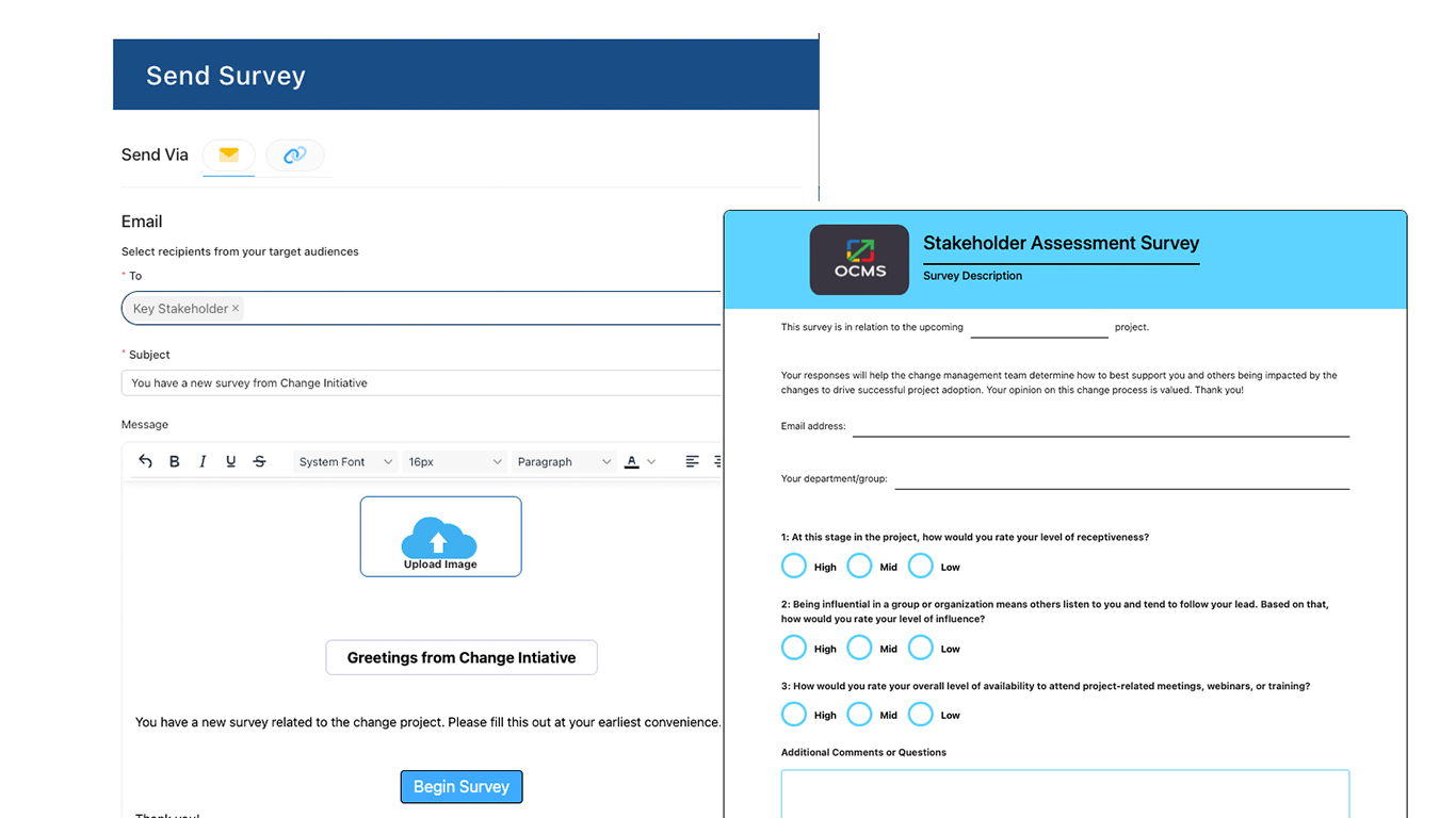 Whether you’re doing a marketing stakeholder analysis, a HR stakeholder analysis, NHS stakeholder map, or policy stakeholder analysis, the built-in surveys in the OCMS Portal save you hours of work, by collecting key data and populating it into your reporting and stakeholder mapping chart automatically. Try it for free today.